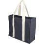 Bevásárlótáska 15 cm-es talpszélességgel és hosszú vászon fogantyúkkal. A farmer anyag 65% poliészterből és 35% pamutból készült. Egy nyomógombbal zárható. A farmer színtartóssága 2-3 szintig terjed. Anyaga: 280 g/m2.