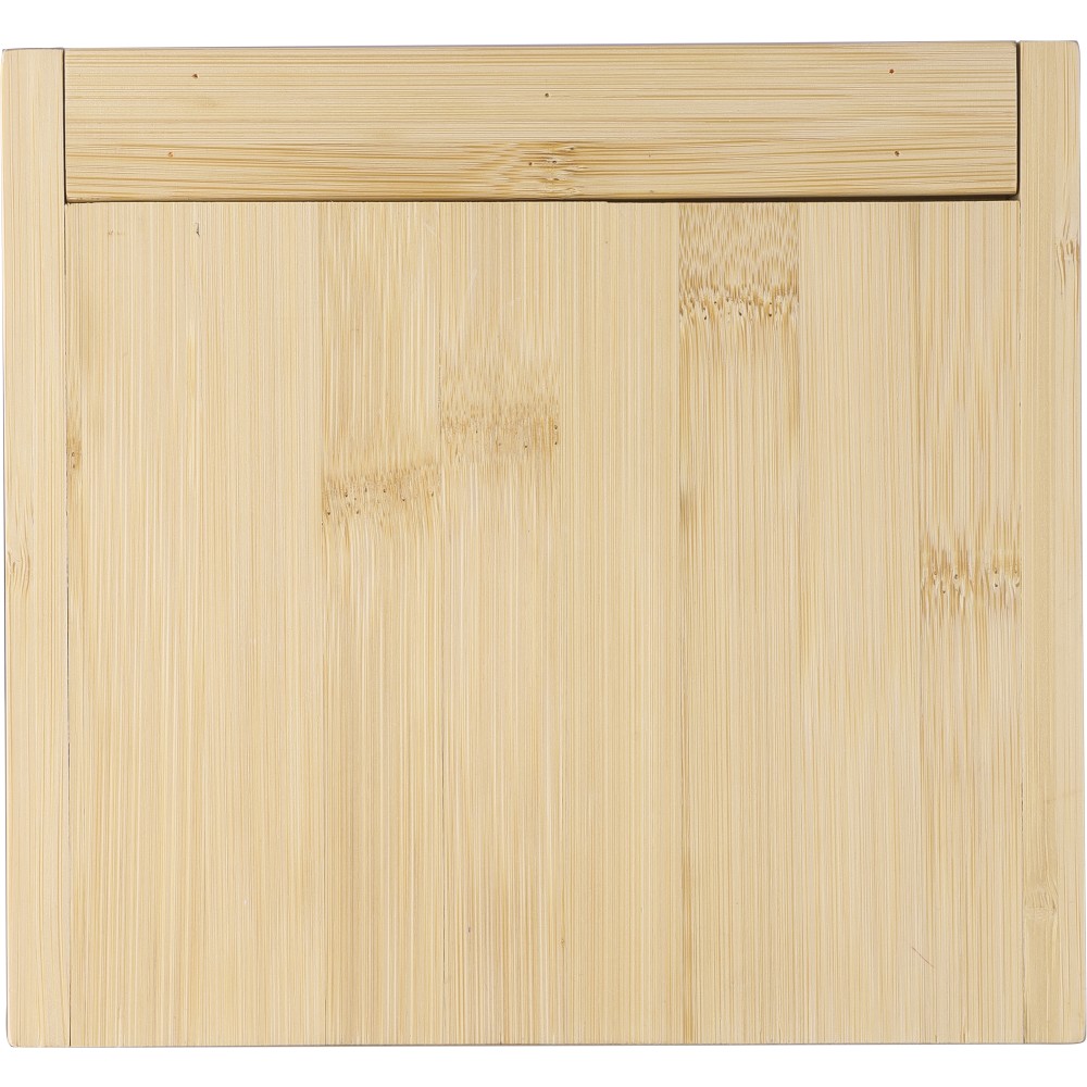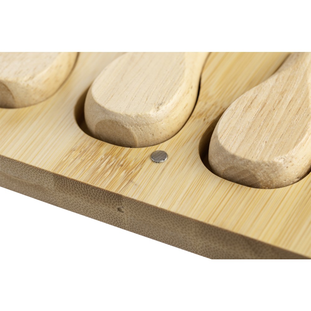 Bambusz sajtvágó deszka kihajtható fedéllel és 4 db, bükkfa nyéllel rendelkező rozsdamentes acél eszközzel. A dobozban kényelmesen elhelyezhető minden sajtkés. Csomagolása barna papírdoboz.