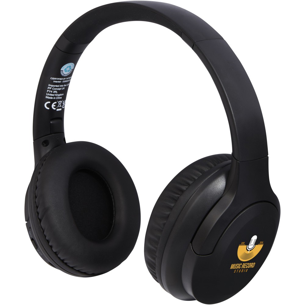 Vezeték nélküli fejhallgató RCS tanúsítvánnyal rendelkező újrahasznosított műanyagból. Az RCS (Recycled Claim Standard) egy szabvány a termék újrahasznosított tartalmának ellenőrzésére a teljes ellátási láncban. A fejhallgató tartalmaz egy mikrofont a telefonhívások fogadására, a nagy fejhallgató fantasztikus hangélményt biztosít. Bluetooth 5.2 akár 10 méteres csatlakozási hatótávolsággal. Ergonomikus, szivacsos kialakítás a kényelmes illeszkedésért. A fülkagylók felhajthatók és forgathatók. A beépített 300 mAh-s újratölthető akkumulátor akár 12 órás lejátszási időt biztosít maximális hangerőn. Ajándékdobozban, használati útmutatóval szállítjuk (mindkettő fenntartható anyagból készült). Újrahasznosított ABS műanyag.