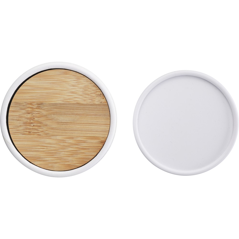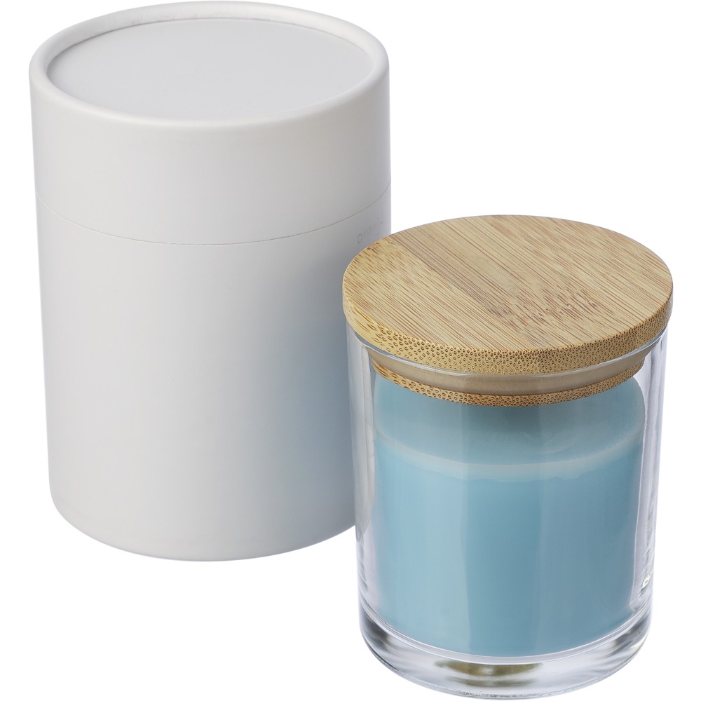 Üveg gyertyatartó 120 g vanília illatú, színes viasszal és bambusz fedéllel. Kb. 20 óra égési idővel. Csomagolása fehér papírhenger.