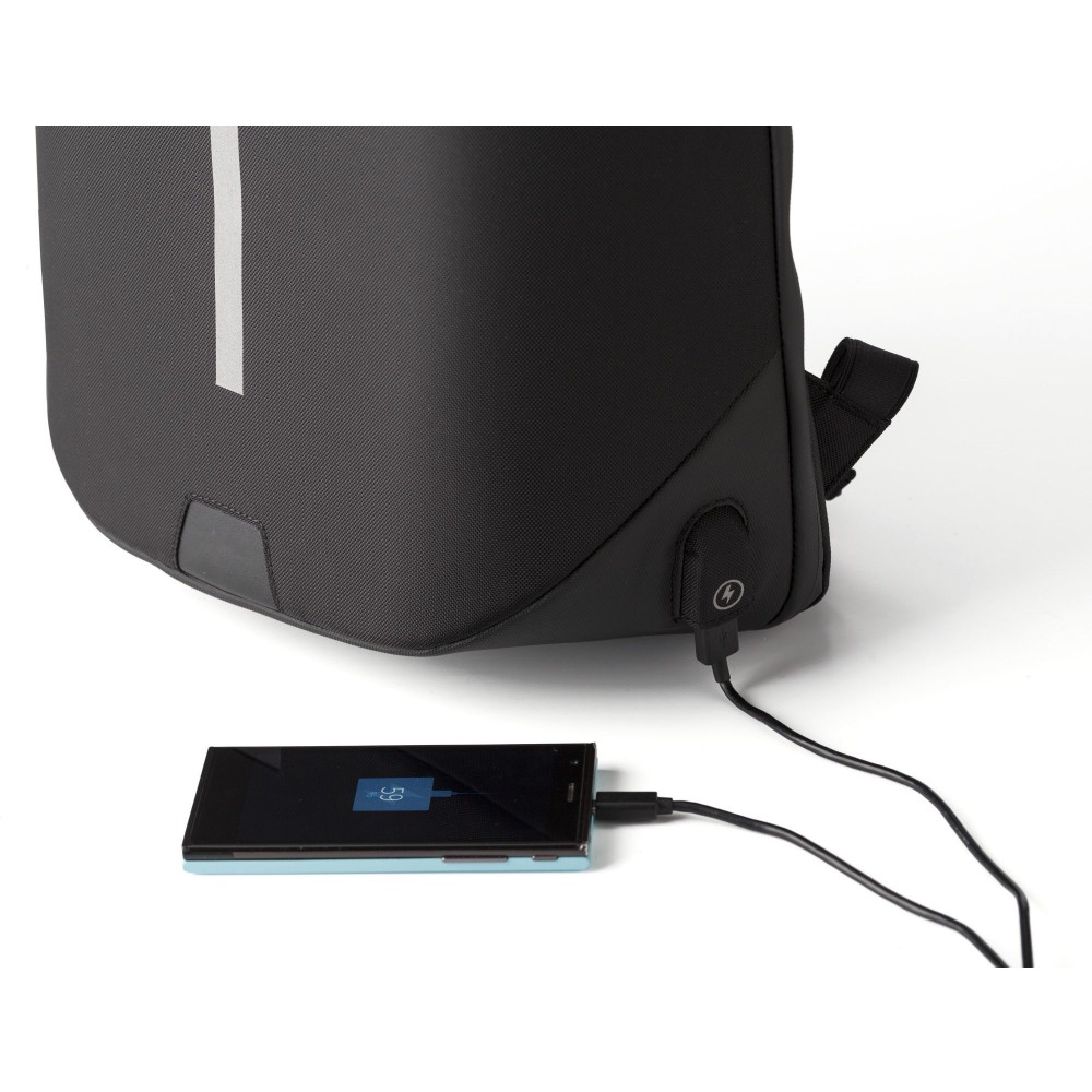 Hátizsák több belső zsebbel, párnázott rész a 15"-es laptop számára, párnázott, állítható vállpánt. 3 karakteres számkonbinációs lakat, fém fül, USB port és vezeték, fényvisszaverő csík, könnyített súlyeloszlást biztosító kialakítás. 1200D nylon anyag.