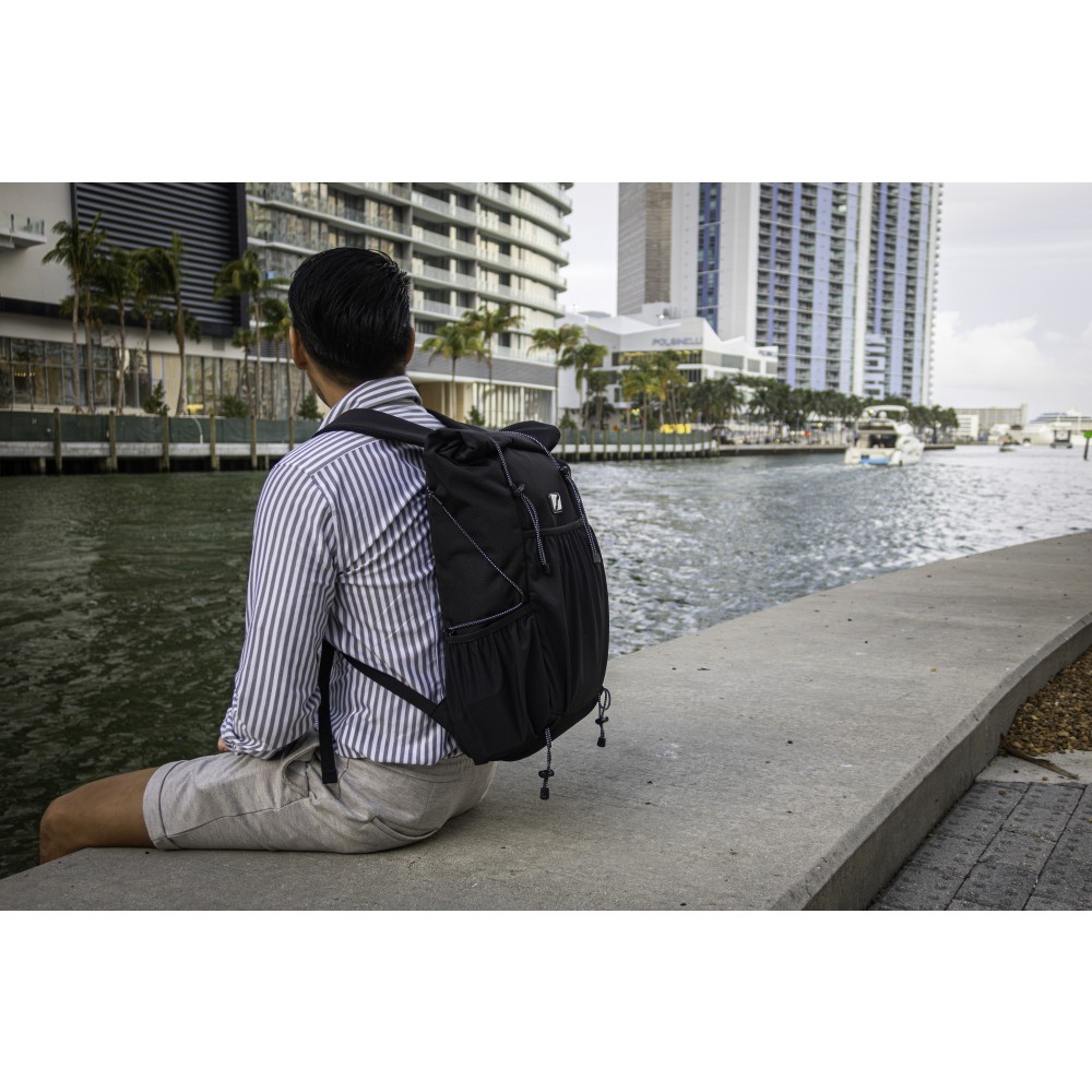 A Venturer roll-top hátizsák egyszerre stílusos és környezetbarát kiegészítő, így kiváló céges ajándék. Újrahasznosított PET-palackokból készült, és a fenntarthatóság iránti elkötelezettséget tükrözi, miközben elegáns dizájnt kínál. Tágas fő rekeszében, több sztreccs zsebében és párnázott laptoprekeszében, melyben16"-es laptop is elfér, bőséges tárolást biztosít a legfontosabb dolgoknak. A könnyű és helytakarékos Venturer ideális ingázáshoz, utazáshoz vagy hétköznapi kirándulásokhoz. Jellemzők: állítható vállpánt, roll-top záródás, szellőző vállpántok, valamint víz- és folttaszító anyag.