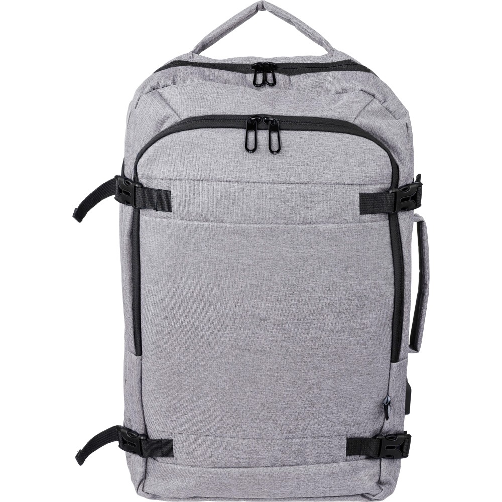 Hátizsák és laptoptáska 17"-es készülékhez. Kézipoggyász méretű. Hordozófüllel a tetején és oldalain. Tépőzáras laptop rekesszel, lopásgátló zsebbel és két nagy cipzáras rekesszel. Szellőző, párnázott hátoldallal, bőröndre húzható pánttal, zárócsatokkal és oldalsó USB-A porttal rendelkezik. Oldalsó csatok segítik a csomag kompakt tartását. Terhelhetősége kb. 12 kg. RPET alapanyagra utaló címke. Anyaga: 300D rPET poliészter.