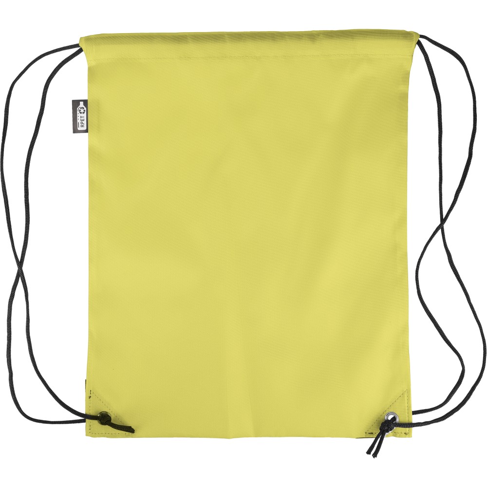 Tornazsák 210D poliészter anyagból, fekete PU sarokerősítéssel az elején, és belső varrással. Fekete nylon húzózsinórral, egy rekesszel. Űrtartalom: 5 liter, teherbíró képesség: 7 kg. rPET címkét tartalmaz.