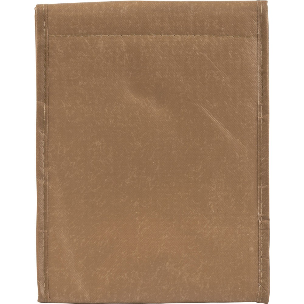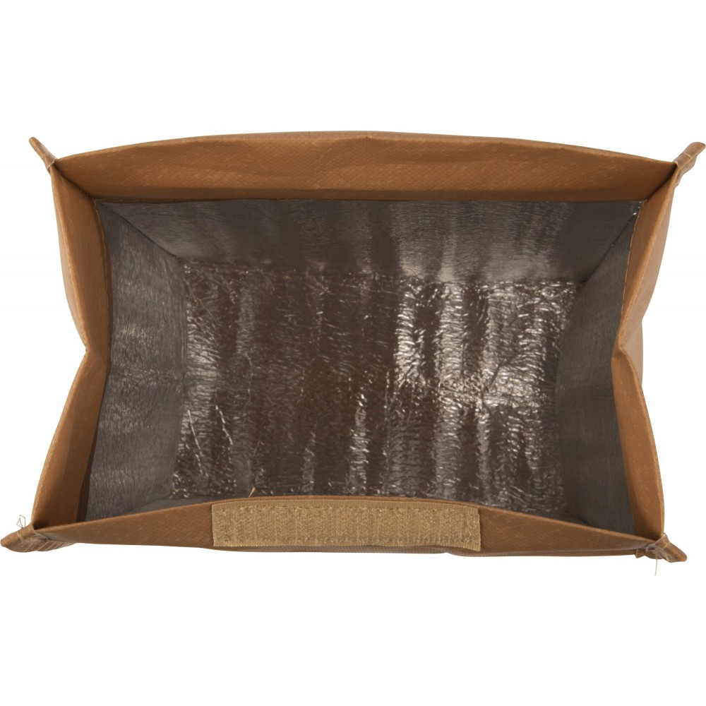 Laminált hűtőtáska barna papírzacskó design-nal. Belül szigetelő fóliával bélelve. 90 g nemszőtt, laminált anyag.