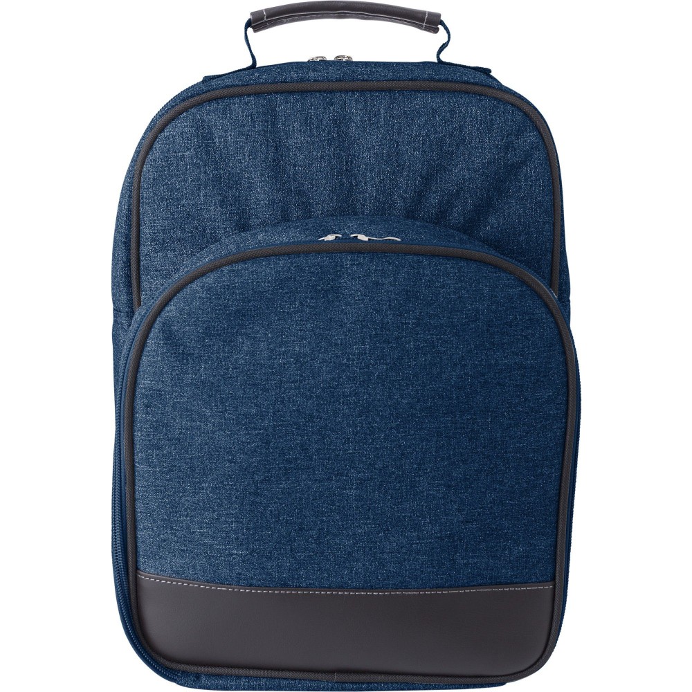 Piknik hűtőhátizsák alumínium fólia béléssel, 2 személyes. Egy nagy főrész, egy cipzáros elsőzseb evőeszközökkel és tányérokkal, állítható vállpánt. 600D művászon.
