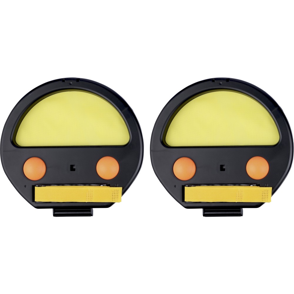 Labdajáték készlet két fogóval és négy labdával. A játék fogórészén zárral és tépőzárral, mely a kézhez való rögzítést segíti. Csomagolása barna papírdoboz. ABS.