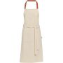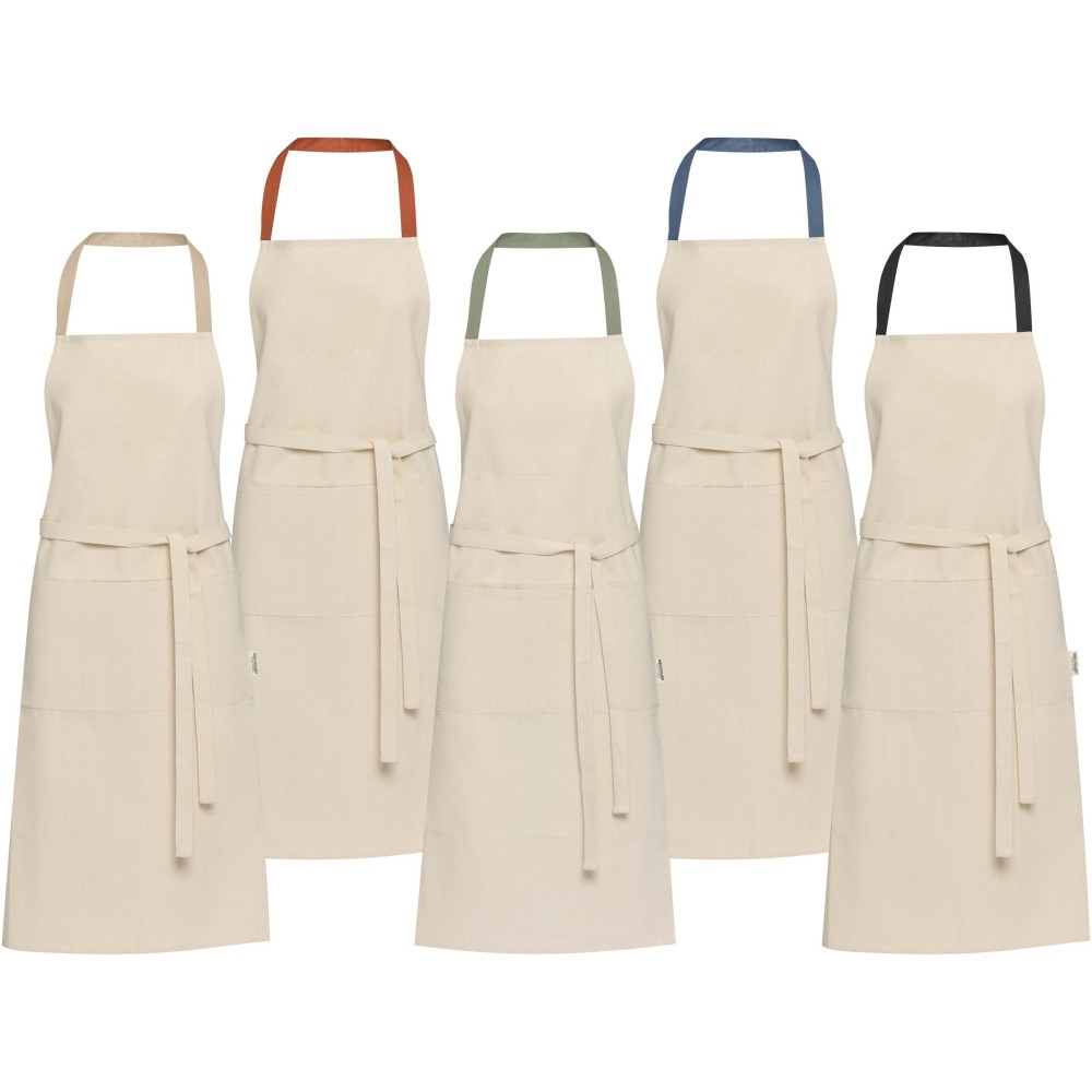 A Nia kötény 100% GRS tanúsítvánnyal rendelkező, 200 g/m2 újrahasznosított pamutból készült. Természetes pamut színe és kontrasztos nyakkpántja elegánsan védi ruhádat főzés közben. Két egymás melletti zsebbel rendelkezik, összesen 45 x 20 cm-es mérettel, és 1 méter hosszú pánttal rögzíthető hátul.