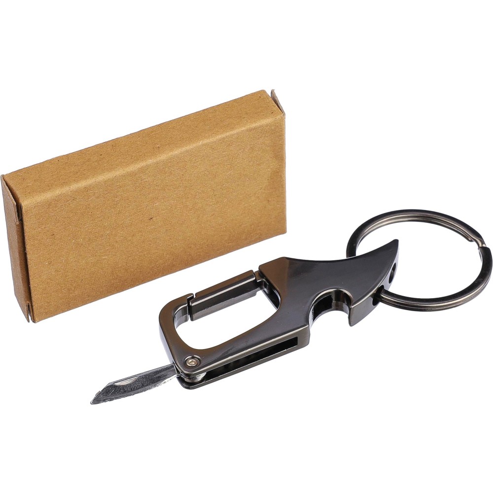 Karabiner kulcstartó sörnyitóval és kis késsel. A kulcstartó fém része elektrolizált. Egyenként barna papírzacskóba csomagolva. Anyaga: fém.