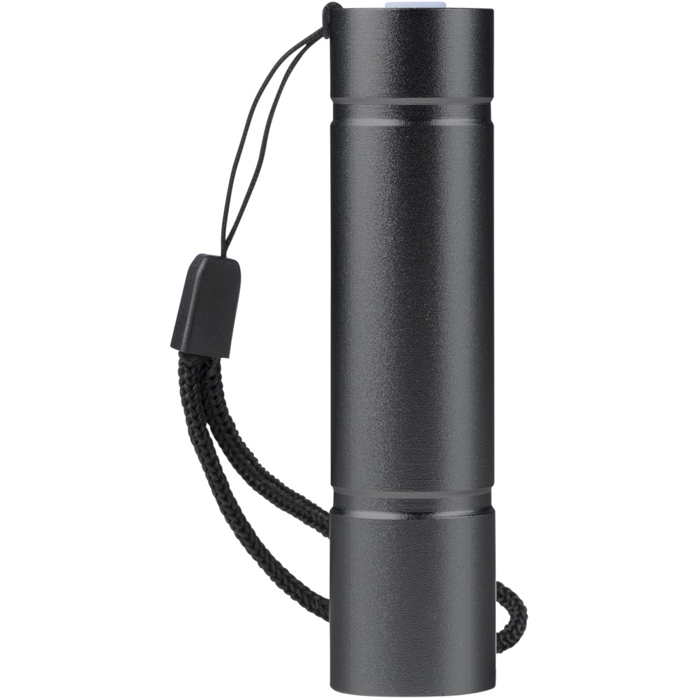 Újrahasznosított alumíniumból készült COB zseblámpa (80-100 lumen) 3 világítási móddal, nyomógombbal, csuklópánttal és gravírozott recycled (újrahasznosított) alapanyagra utaló logóval. USB-C-n keresztül újratölthető (300 mAh), a csomag része egy 30 cm-es kábel. Illusztrációval ellátott barna dobozba csomagolva.