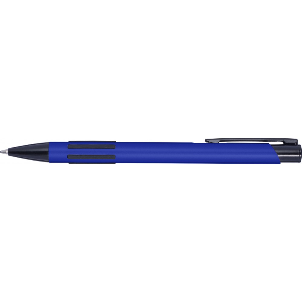 Golyóstoll lakkozott felülettel, nyomógombbal, kék tollbetéttel. A klipsz, a hegy és a gumis fogófelület színe illeszkedő fekete., alumínium, PVC, gumi