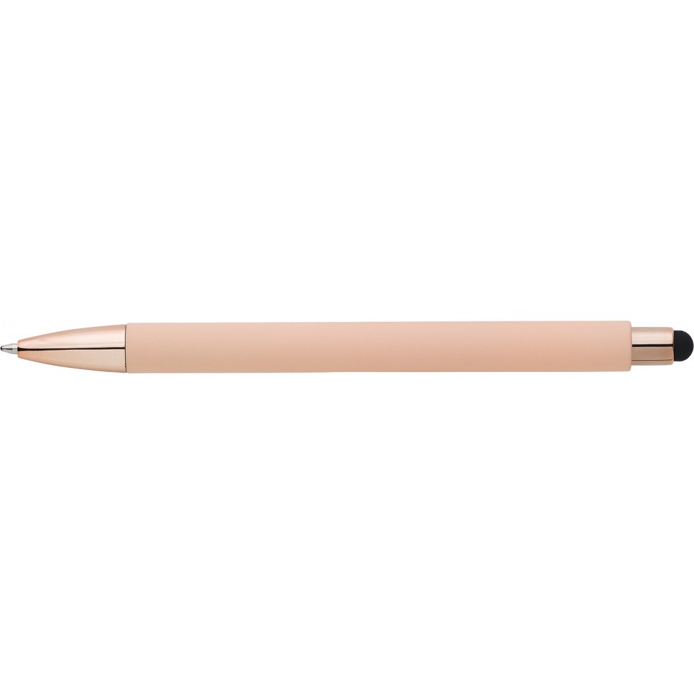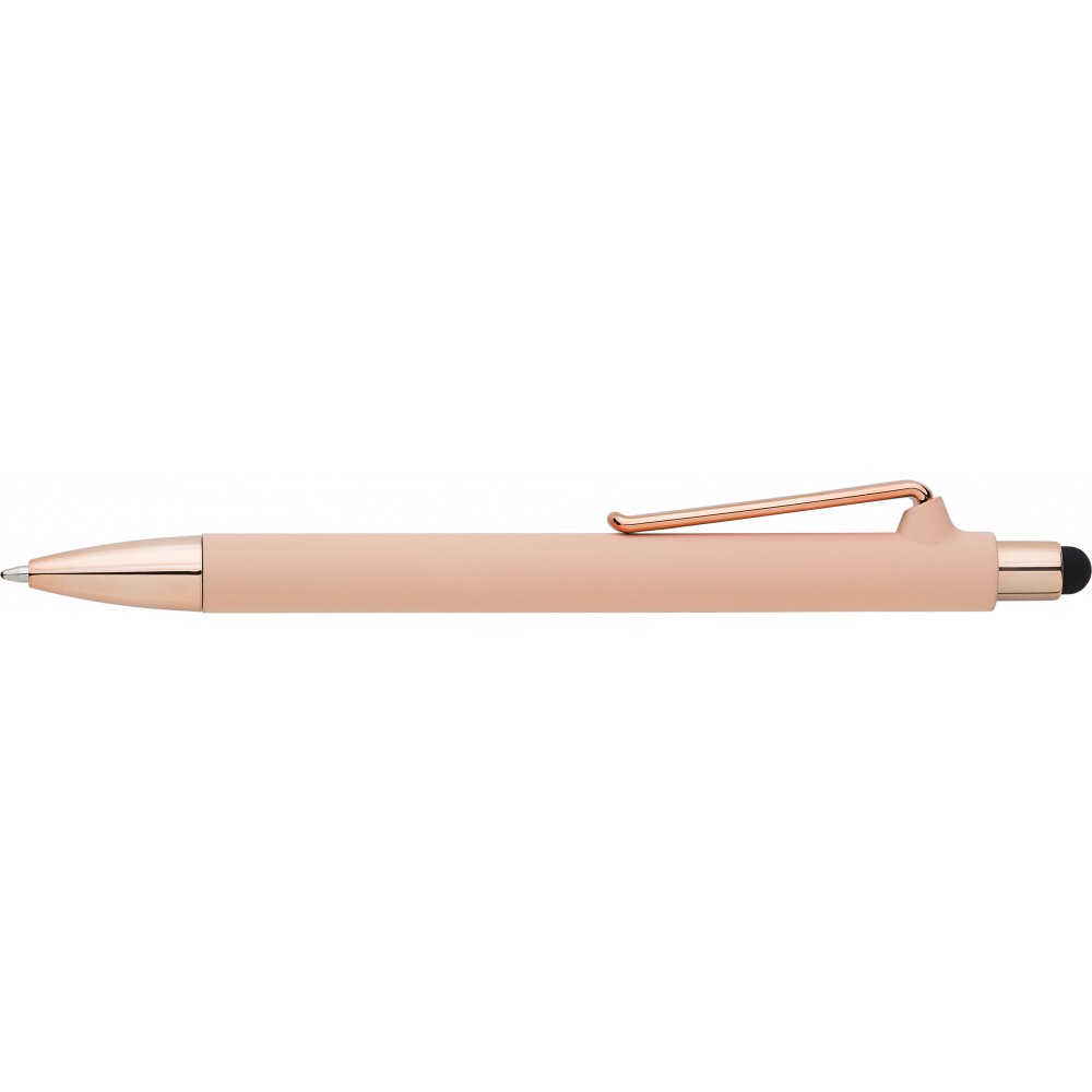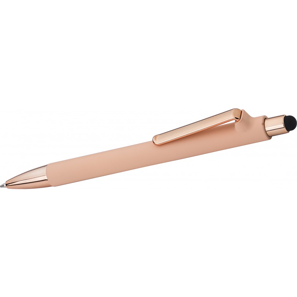 Golyóstoll gumis bevonattal és UV színű részletekkel, érintővel, kék tollbetéttel. ABS, PP műanyag, szilikon, vas.