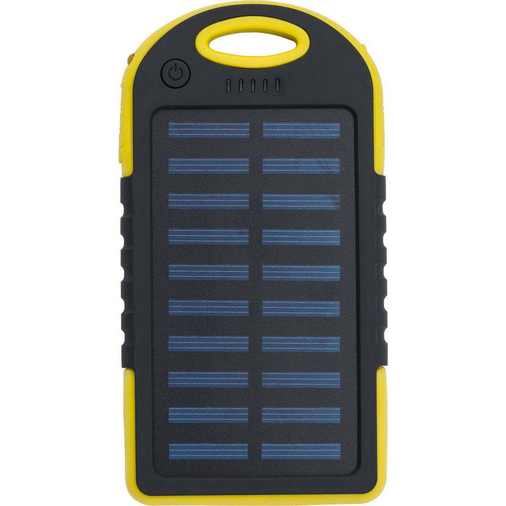Gumírozott ABS napelemes powerbank zöld jelzőfénnyel és oldalsó elemlámpával. Két USB és egy USB-C porttal. Napelemes töltés: 5V/200mA. Input DC 5V/1A. Output DC 5V/2x1A. Kapacitás: 4.000mAh. USB kábellel.