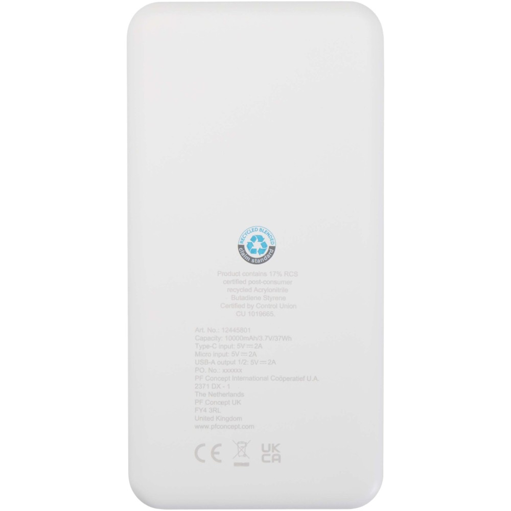 Az Intan 10.000 mAh-s powerbank újrahasznosított műanyagból készül, megbízható energiát biztosítva egész napra. Két USB-A kimeneti porttal, egy Type-C bemenet/kimenettel és egy micro-USB bemenettel rendelkezik, így sokoldalú töltési lehetőségeket kínál. Karcsú kialakítása modern megjelenést ad, az integrált LED-jelző pedig egyértelműen mutatja a töltési állapotot.