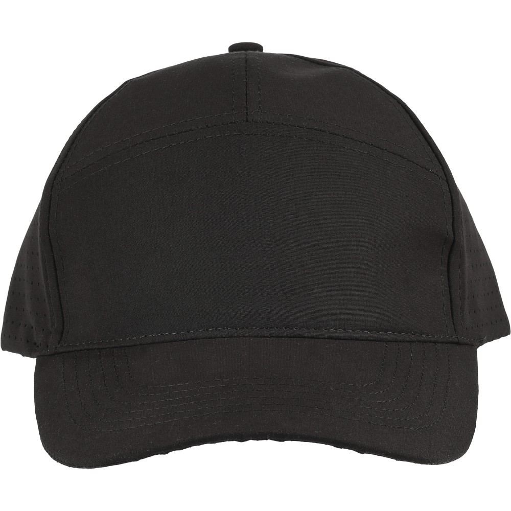 7 paneles poliészter baseballsapka lézervágott szellőzőnyílásokkal a hátsó paneleken. 7 cm-es ellenzővel, tépőzárral állítható pánttal, PU címke nélkül.