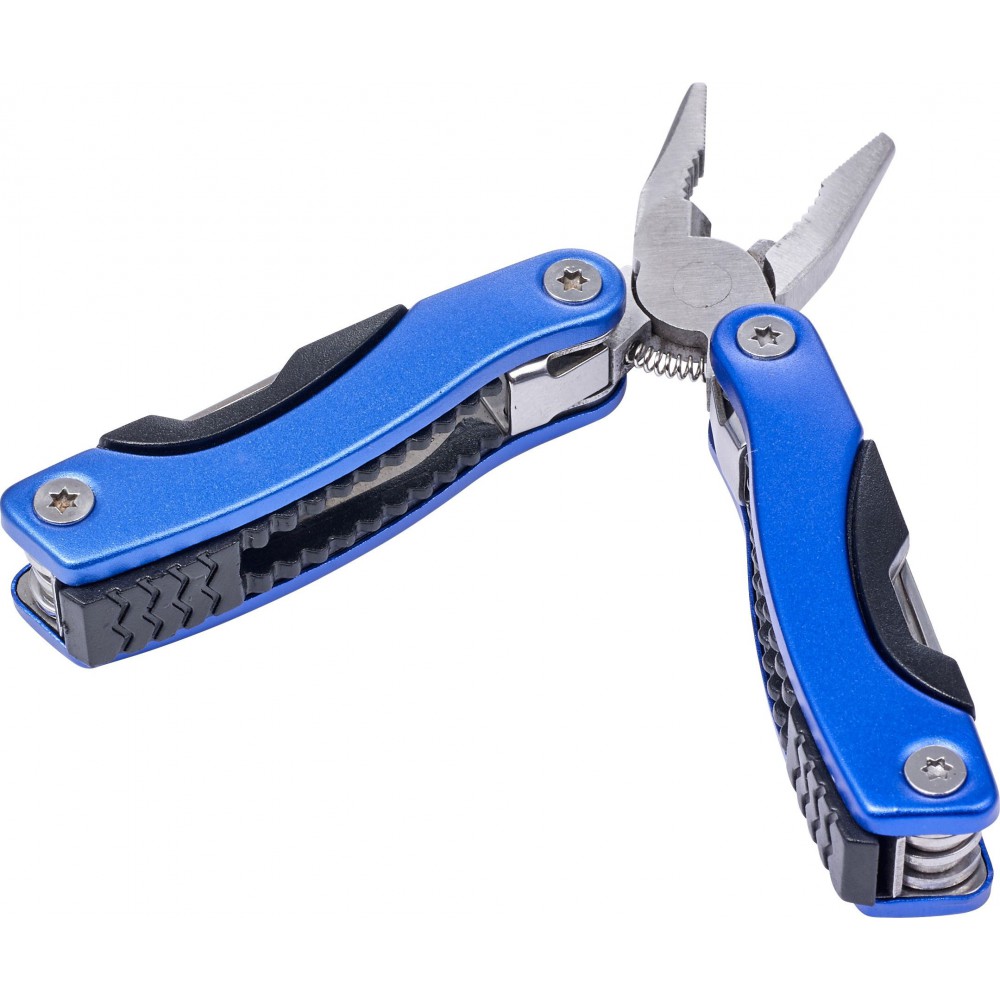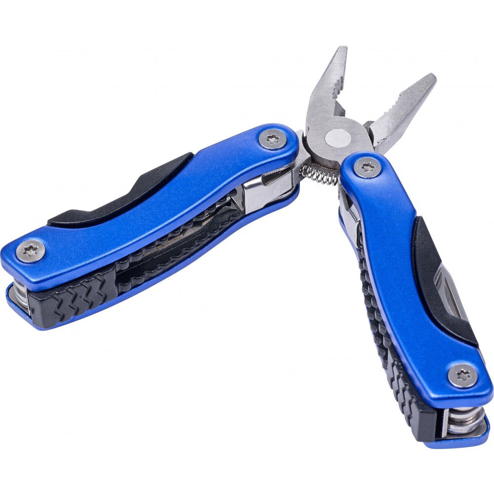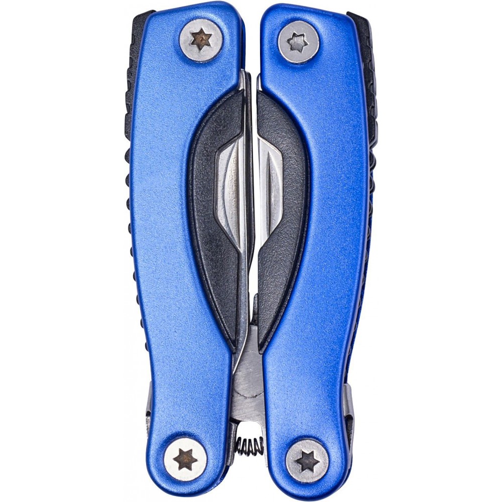 Kompakt multifunkciós szerszám. Funkciók: csavarhúzók (laposfejű és Phillips), reszelő, fűrész, kés, diótörő, doboznyitó és üvegnyitó. Alumínium, rozsdamentes acél