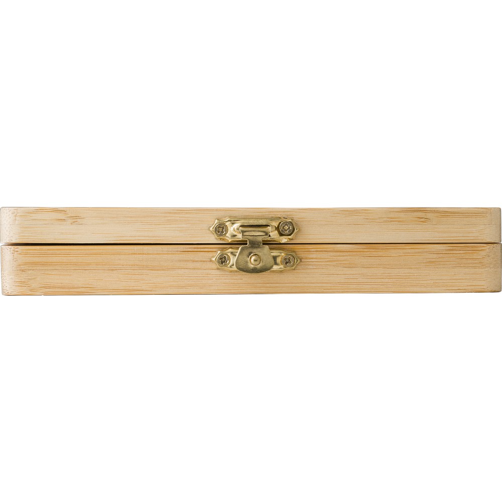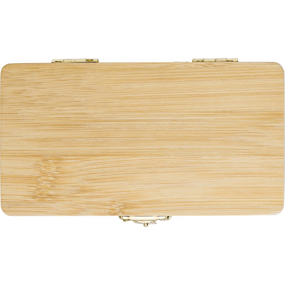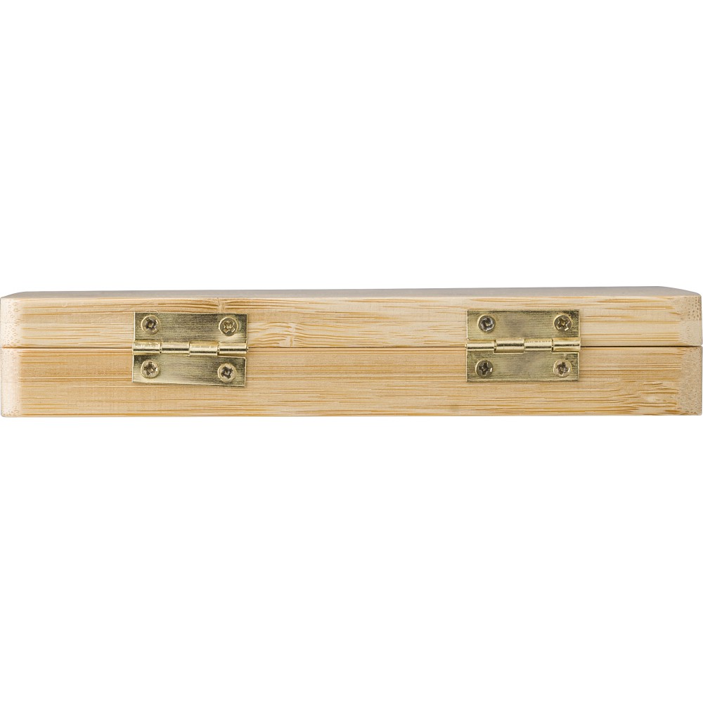 25 darabos szerszámkészlet bambuszdobozban. 24 db hegy és egy fogó. Csomagolása barna papírdoboz.