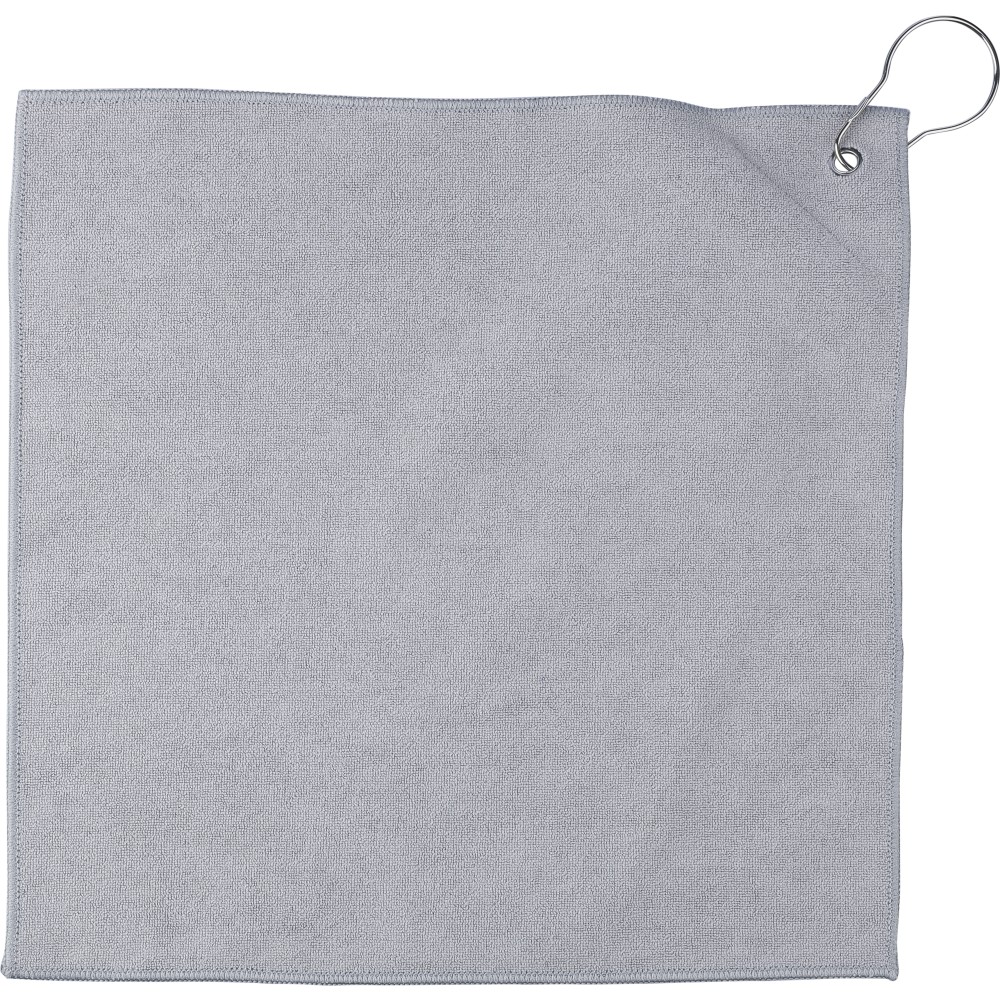 rPET golftörölköző tartozék labdatartó tokkal. A fém kampó segítségével könnyen a táskához csatlakoztatható. Belül rPET címkével. Mosógépben alacsony hőmérsékleten mosható.