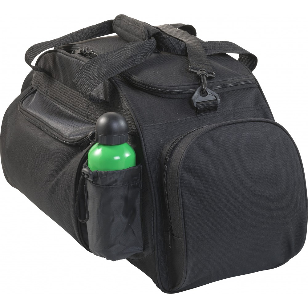 600D poliészter utazótáska egy első zsebbel, egy palacktartó és egy headset elhelyezésére való oldalzsebbel és egy nagy cipzáros rekesszel.