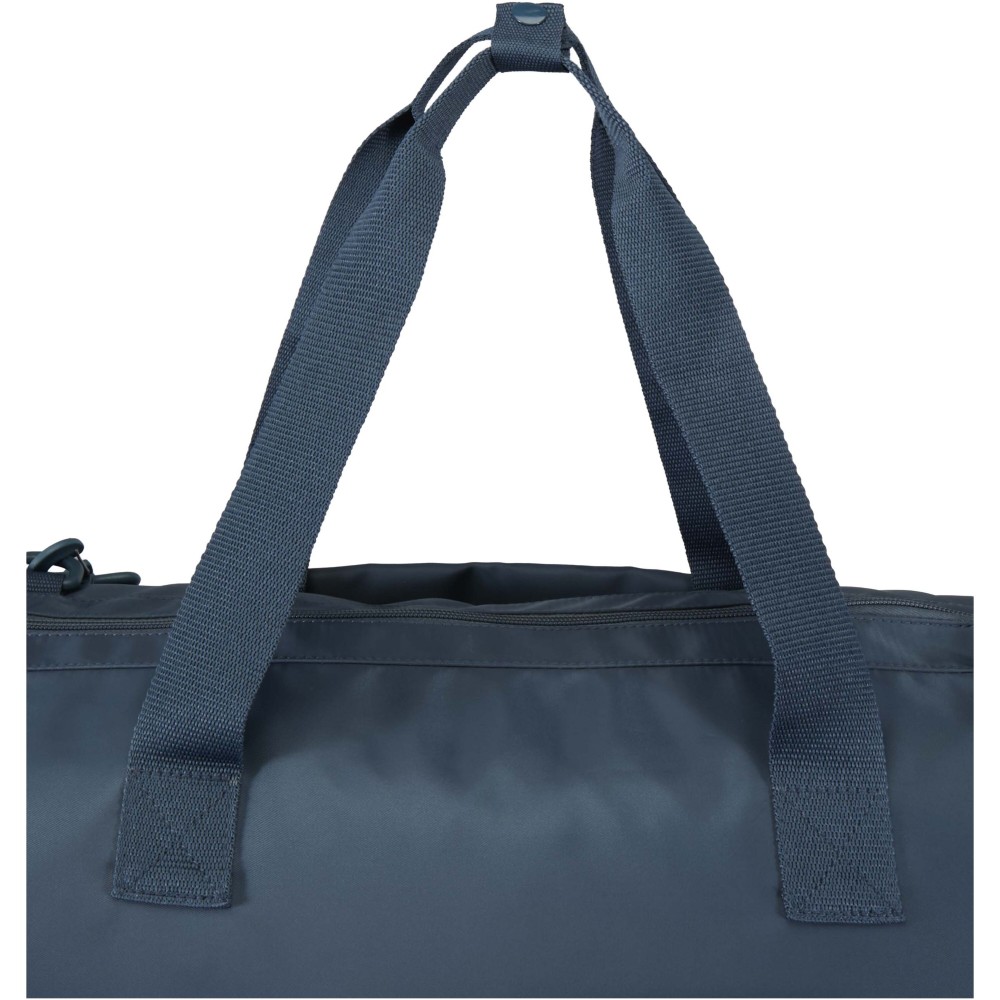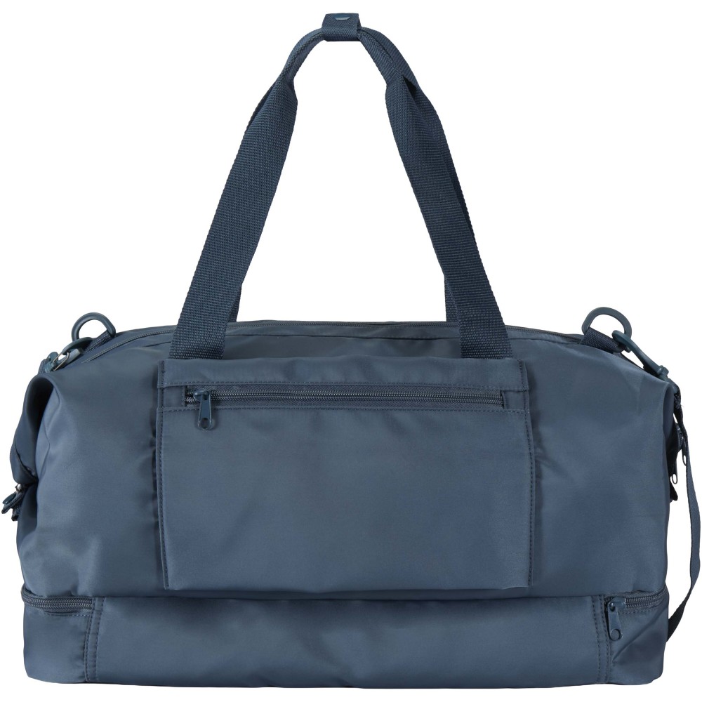 A Trip Aware® újrahasznosított utazó sporttáska sokoldalú és tágas társ, ideális rövid kiruccanásokhoz, valamint a szükséges holmik kényelmes szállításához. Tartós 290D twill poliészterből készült, puha kötött hátoldallal, RPET 210D/PU béléssel, így praktikus használatot és kényelmet biztosít. Fő rekesze nagy cipzáras zsebet tartalmaz, útlevél, tollak és kulcstartó szalag számára kialakított hellyel, valamint két belső nyitott zsebbel és dupla kulacstartóval. Külön alsó rekesze kagylószerűen nyílik, tökéletes cipők vagy egyéb felszerelések elkülönített tárolására. Minden táska Aware® nyomkövetővel érkezik, amely QR-kód segítségével lehetővé teszi a termék eredetének és útjának nyomon követését, növelve az ellátási lánc átláthatóságát és a kapcsolatot a termék gyártási folyamatával. Űrtartalom: 42 liter.