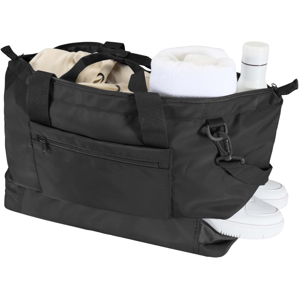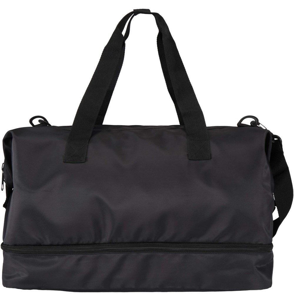 A Trip Aware® újrahasznosított utazó sporttáska sokoldalú és tágas társ, ideális rövid kiruccanásokhoz, valamint a szükséges holmik kényelmes szállításához. Tartós 290D twill poliészterből készült, puha kötött hátoldallal, RPET 210D/PU béléssel, így praktikus használatot és kényelmet biztosít. Fő rekesze nagy cipzáras zsebet tartalmaz, útlevél, tollak és kulcstartó szalag számára kialakított hellyel, valamint két belső nyitott zsebbel és dupla kulacstartóval. Külön alsó rekesze kagylószerűen nyílik, tökéletes cipők vagy egyéb felszerelések elkülönített tárolására. Minden táska Aware® nyomkövetővel érkezik, amely QR-kód segítségével lehetővé teszi a termék eredetének és útjának nyomon követését, növelve az ellátási lánc átláthatóságát és a kapcsolatot a termék gyártási folyamatával. Űrtartalom: 42 liter.