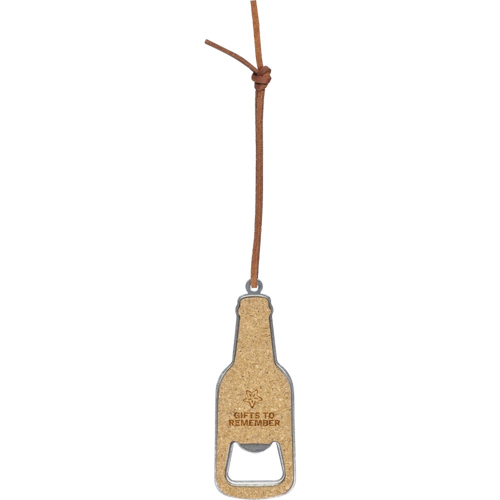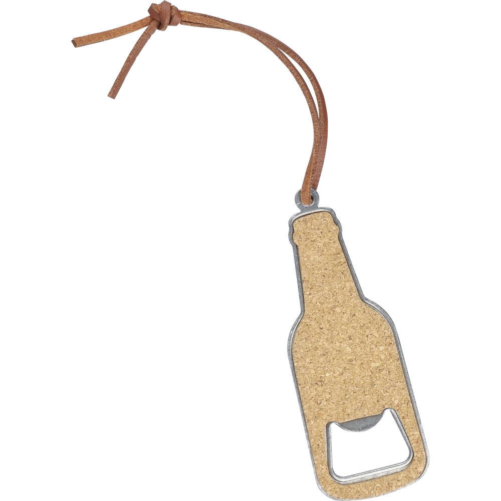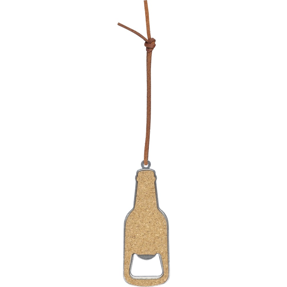 Üvegnyitó rozsdamentes acéból, két oldalán parafa bevonattal, PU akasztózsinórral. Csomagolása barna papírdoboz.