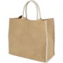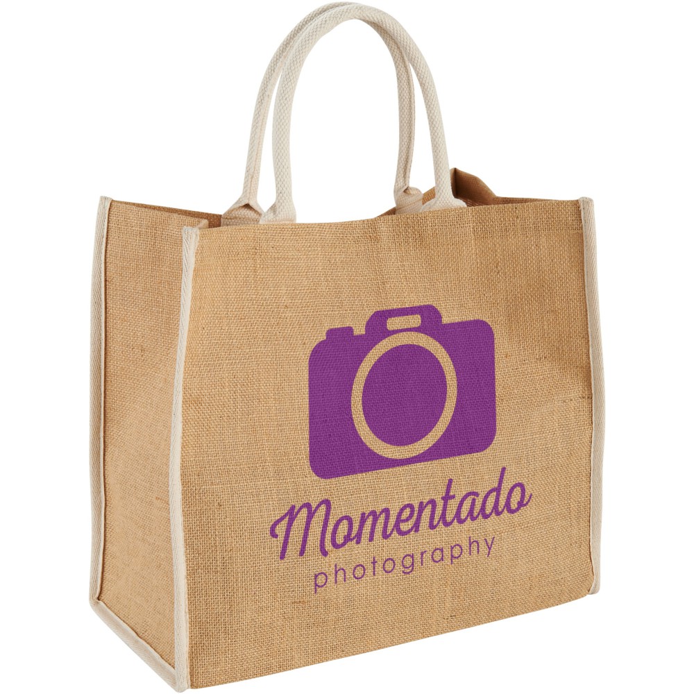 The Large juta bevásárlótáska tépőzáras kialakítással. A lehajtható fülek magassága 17 cm. Megjegyzés: finom grafikát vagy szöveget nem, csak vastag, erős nyomatott lehet az anyagon alkalmazni. Juta.