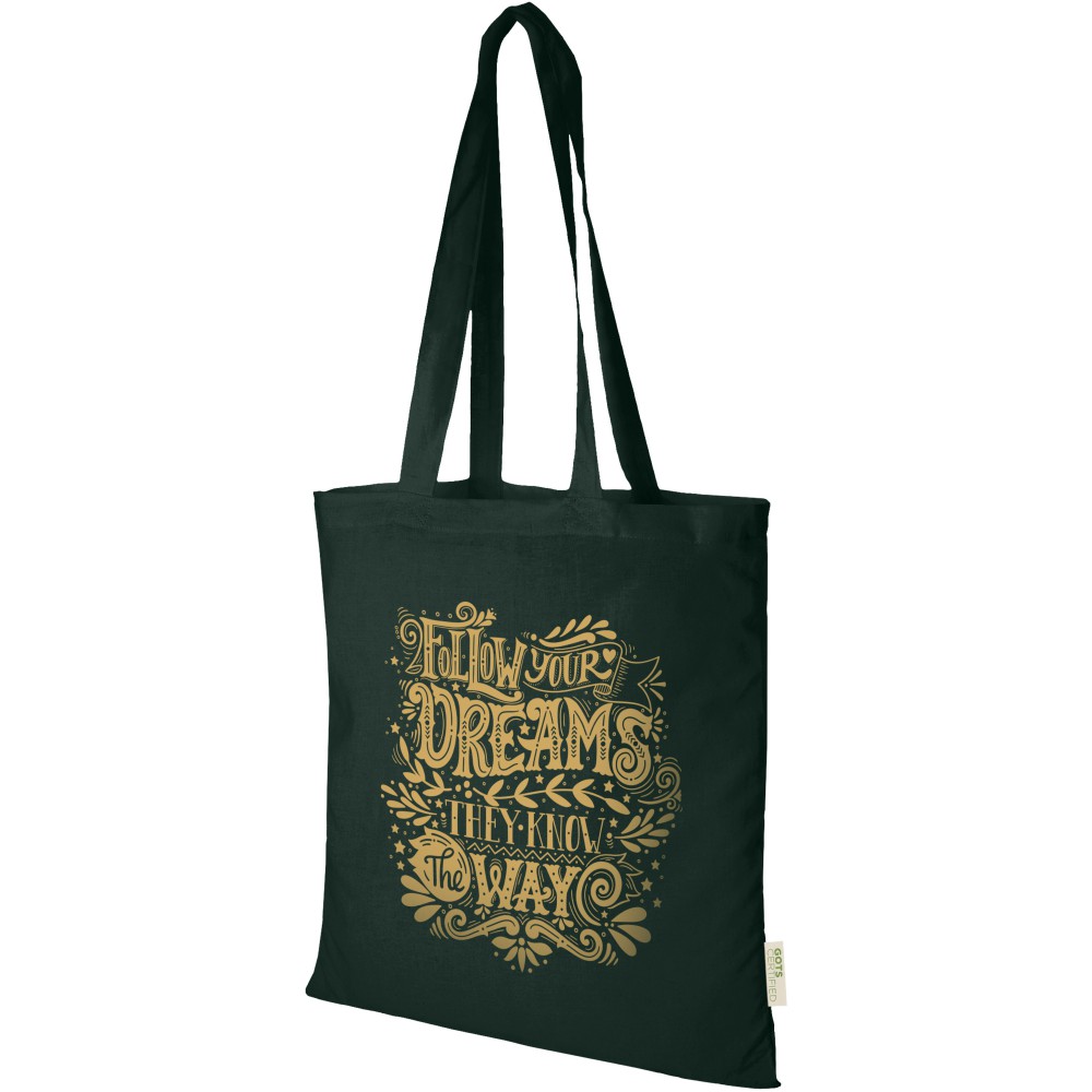 Tanúsított pamuttáska, amely bármilyen rendezvényen, konferencián ajándékozható, majd kisebb élelmiszerek bevásárlótáskájaként használhatja. A 140 g/m2-es pamutsűrűségnek köszönhetően a táska erős, hosszú élettartamú és alkalmas nehéz tárgyak szállítására a nagy fő rekeszben. 32 cm hosszú fogantyúval rendelkezik, így vállon is vihető.